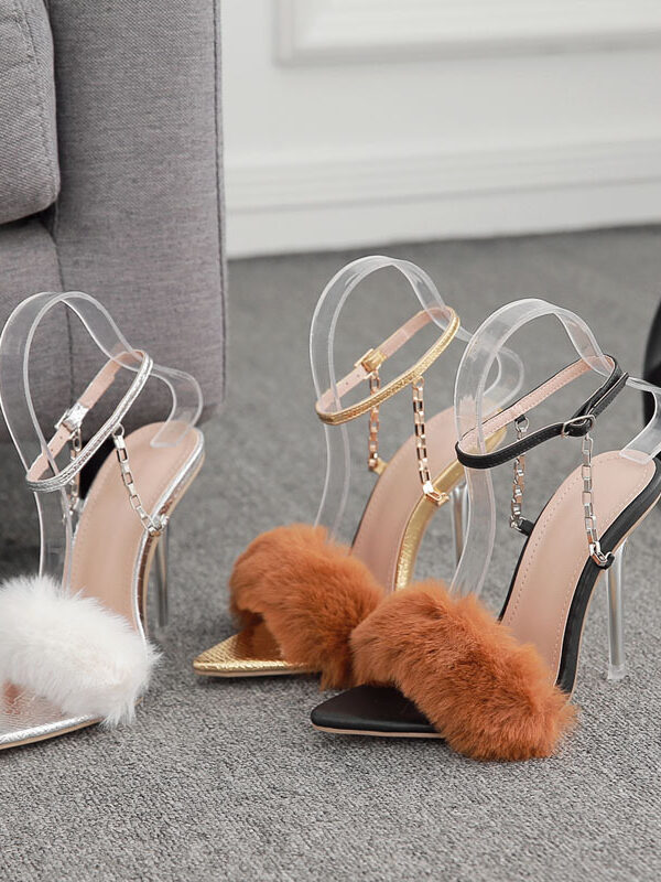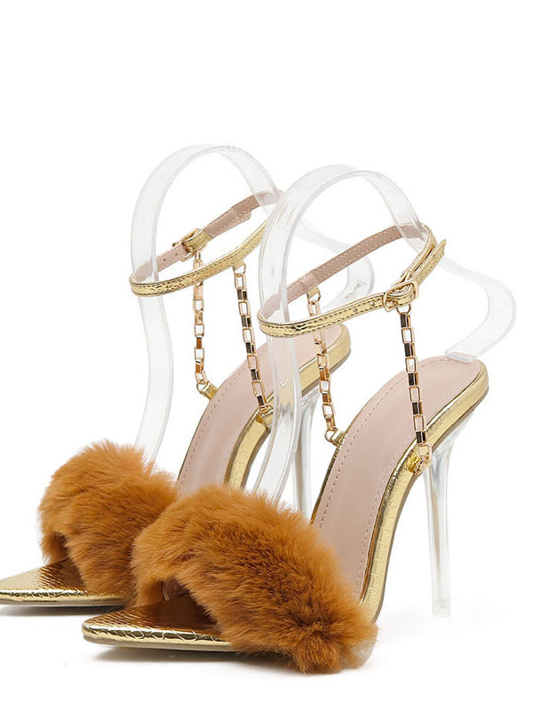 Auch diese goldenen Sandalen mit braunem Pelz sind phantastisch.