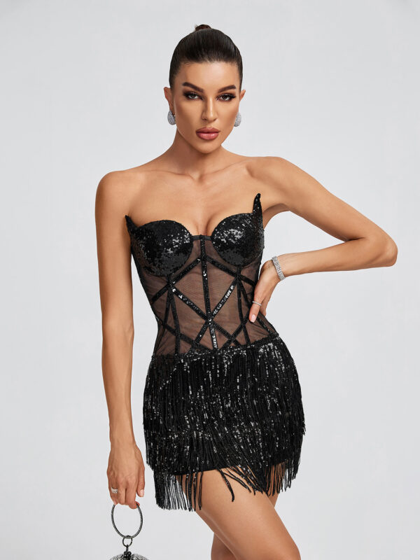 Designed for a stunning look, the Mesh Sequins Corset Mini Dress features intricate mesh and sequin detailing. The corset design flatters the figure while the mini length adds a touch of playfulness. It is perfect for a glamorous night out or special event.