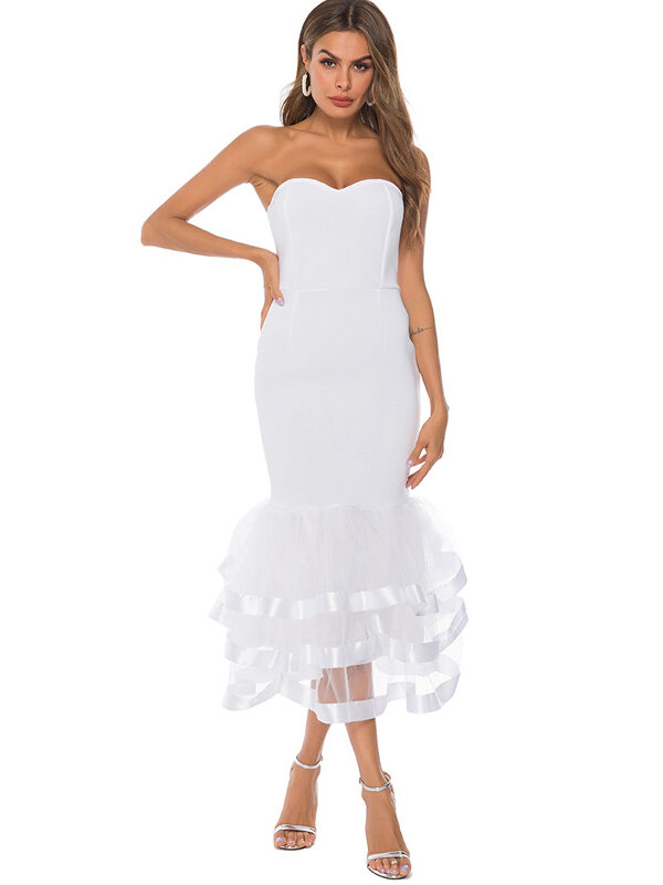 This elegant white bodycon dress will elevate your style. The dress exudes sophistication with its plain pattern and contrasting mesh details. It also features layered layers. The strapless neckline accentuates the shoulders and makes it perfect for any cocktail occasion.