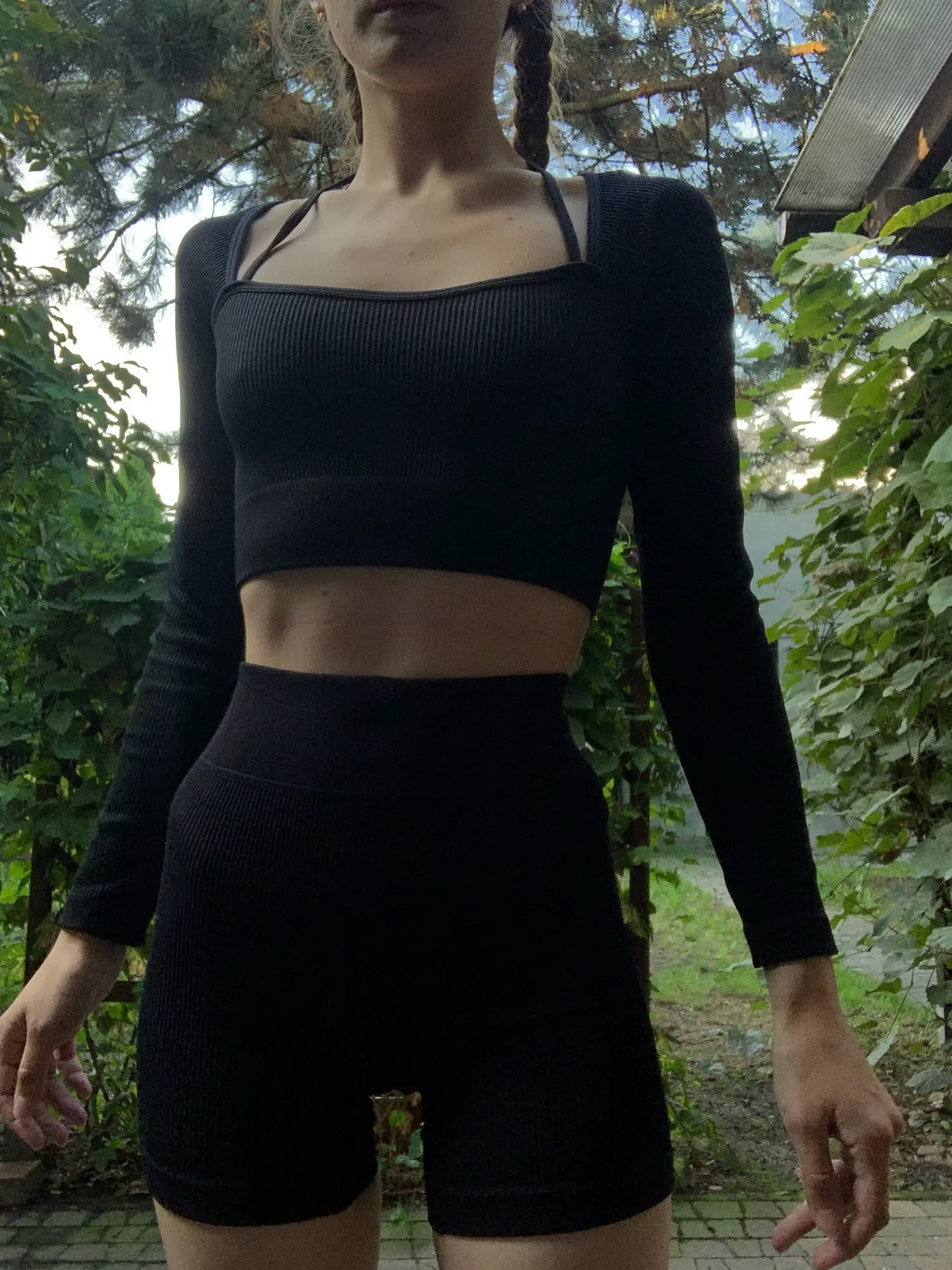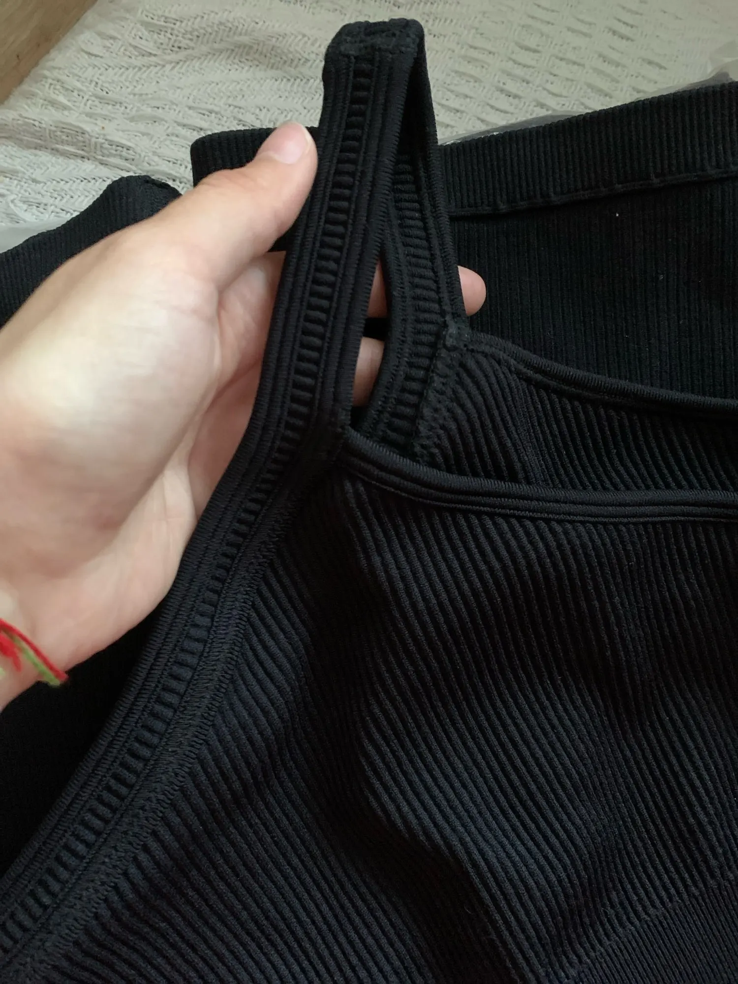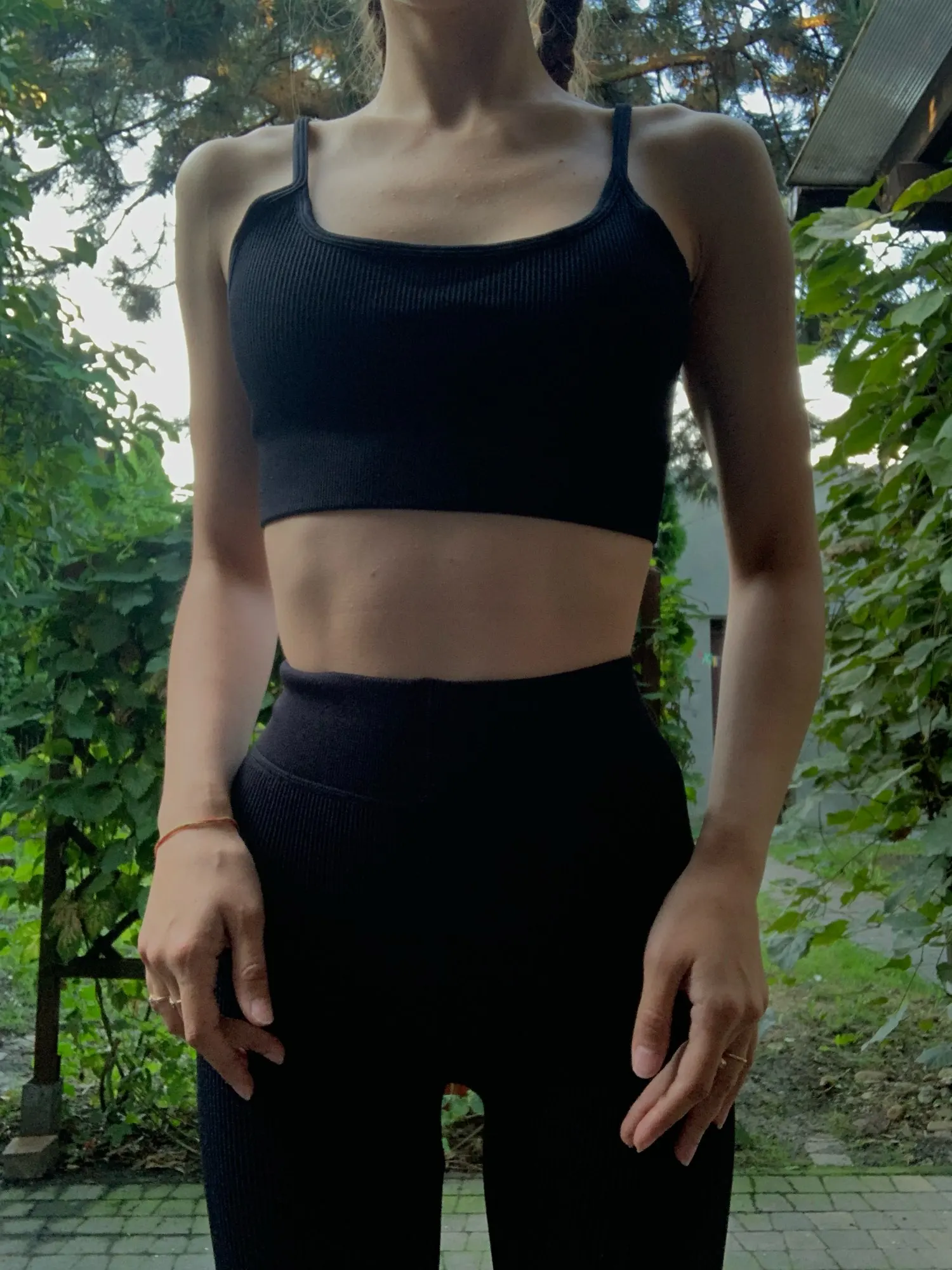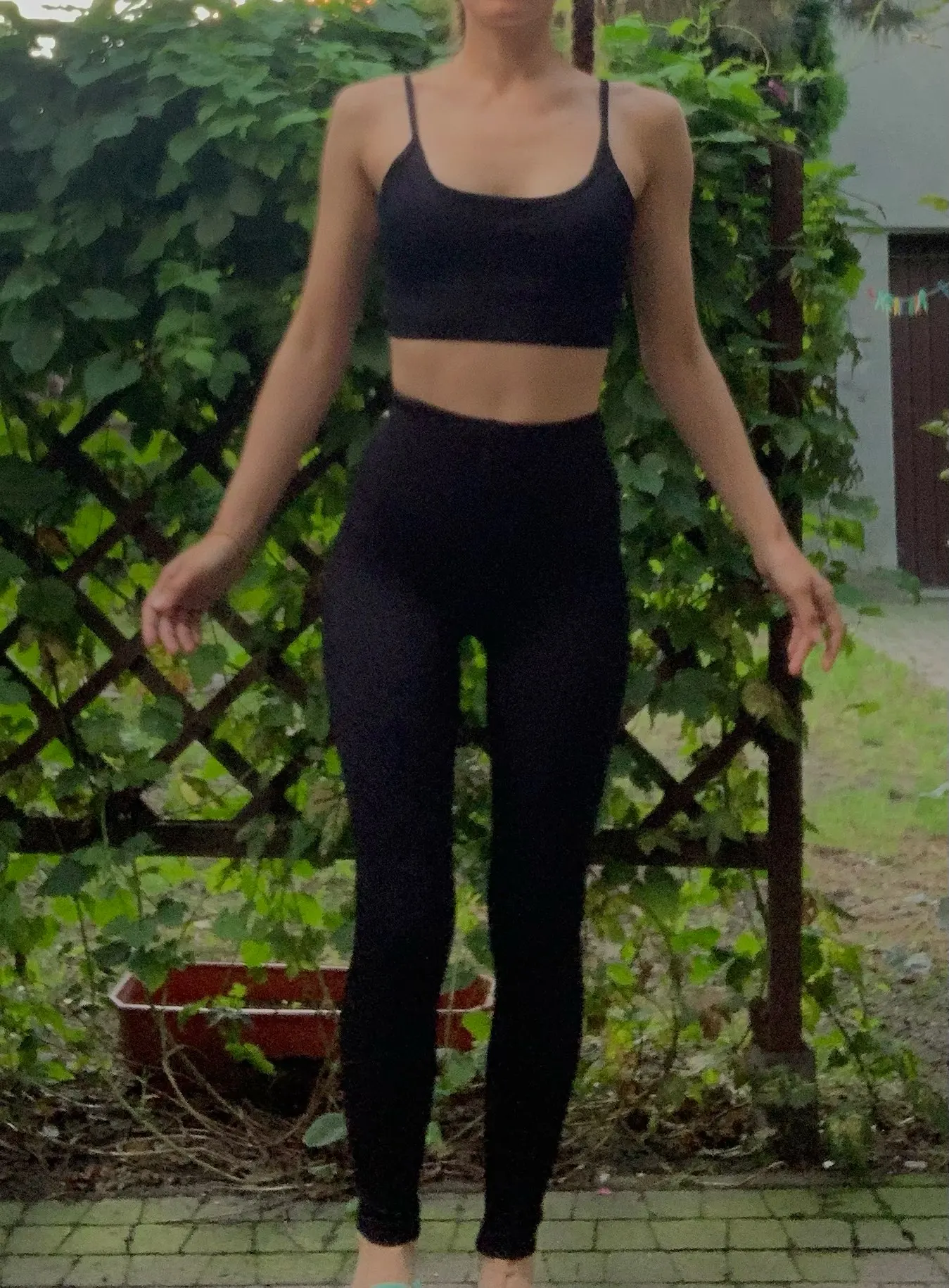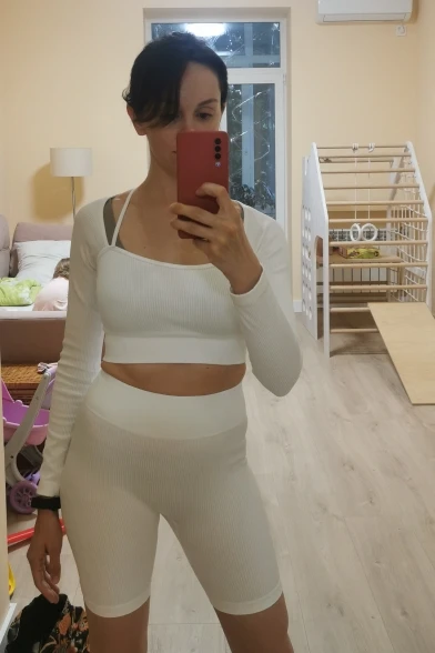 I liked the set. The fabric is dense, does not shine through. He made a mistake with the size and ordered s. The leggings and shorts fit perfectly, and the tops are a little tight. Uncomfortable in a long-sleeved top, because the elastic band presses under the hands (I think it would be better with my size). They all stretch things well. I ordered a tapa with beers from another seller, they had cups. In other tops there are no cups (bra). Sewn all over carefully, all wide elastic bands tighten and hold their shape well. I think I’ll order in another color later and in the right size