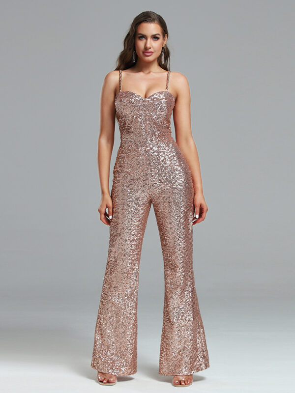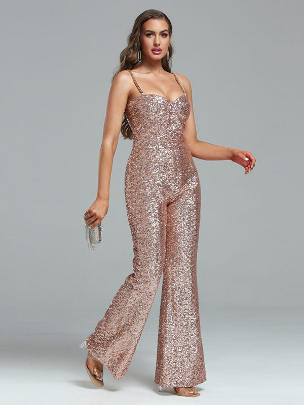 Shiny Spaghetti Strap Chain Wide Leg Jumpsuit