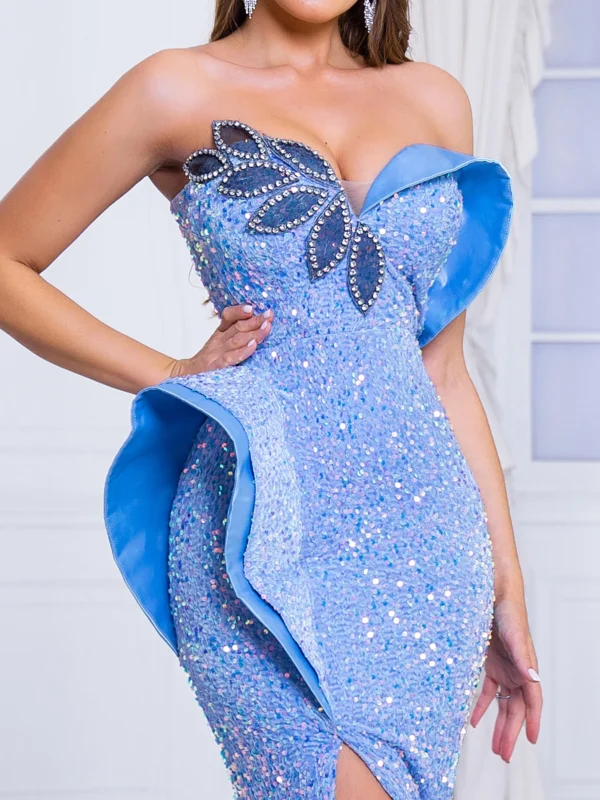 This Sky Blue Yaen Tube Sequin Maxi Dress is ideal for prom or any formal gathering, featuring stunning sequins that shimmer as you move. And decorated with sparkling rhinestones on the bust or tube area while featuring an open drop backless design. Thanks to its front slit it makes this prom dress easy to move in as well.